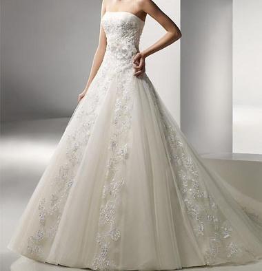 | Vestido todo trabalhado, com brilhos e aplicações de flores. Perfeito para um casamento mais formal à noite. |